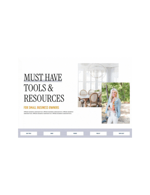 Meet your new resources page with all the bells and whistles! Designed to highlight your best lead magnets, free resources, business tools, podcast recommendations, books, and Amazon or LTK stores. This page is designed to make you money (share all your affiliate links AND links to your opt-ins and offers in one place!) and set you up as the go-to expert in your field.